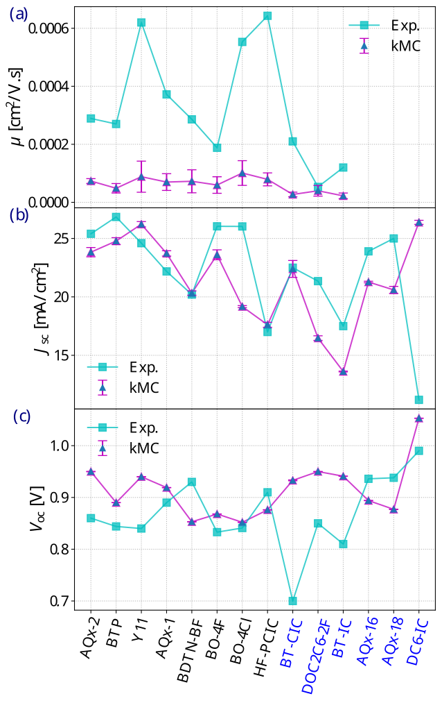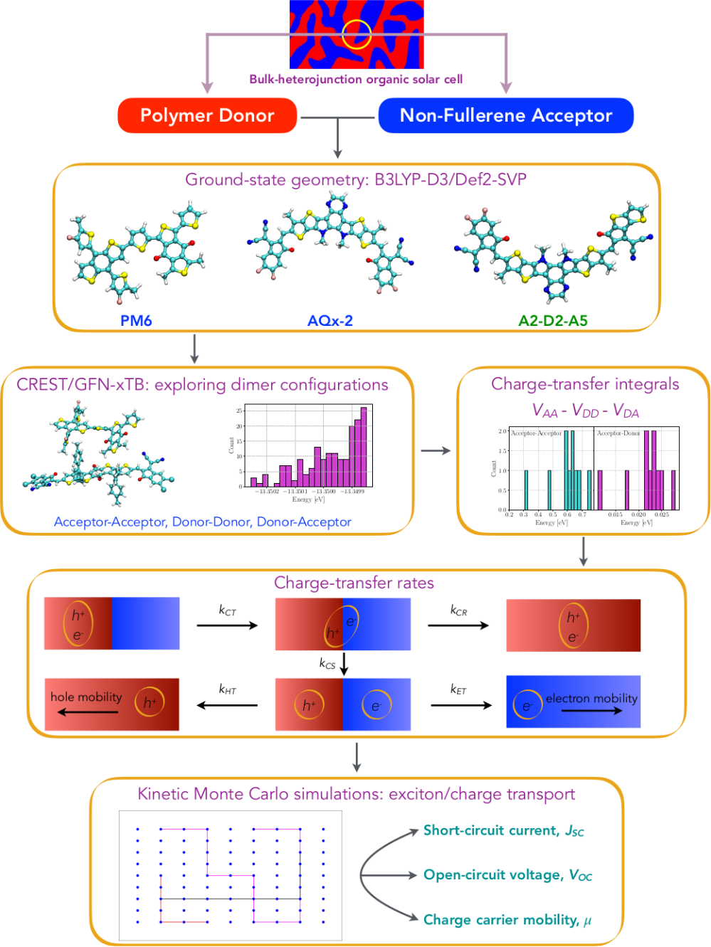 The morphology was calculated accurately by xTB based methods for pairs of molecules, with homojunction as well as heterojunctions, rather than for a section of bulk. Properties of these dimers were obtained by DFT based calculations. These dimers occupied sites of a single cell containing a domain each of donor and acceptor; homo-dimers occupying bulk and hetero-dimers occupying interface positions. A monte Carlo algorithm implemented the processes in solar cell, exciton diffusion, charge transfer state formation, exciton dissociation, recombination, and charge carrier diffusion. Probability of each process was determined depending on position of charge carriers, and acted as weights for a random selection of the next step in path of charge carriers, carried out till charge carriers exited the domains, or exciton recombined. Such a simulation was repeated over several random configuration of dimers. Short circuit current was estimated based on number of carriers colleced from the domains and their mobility, while open circuit voltage was calculated based on interface properties and short circuit current. The values calculated were matched with experimentally measured values, and were found to be in close agreement, making this model suitable for large scale screening of high throughput molecules.